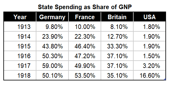The source of this decline in wealth becomes clear when you see the dramatic increase in warring governments’ spending as a percentage of GNP. Spending in order to deliver “bads” to the enemies: