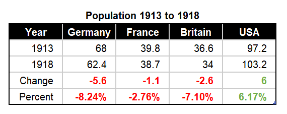 Plus: between 15 and 22 million people died. And another 23 million were wounded and/or disabled. ⁽¹⁾ Further reducing the warring countries’ productivity. And not just during the war, but for decades afterwards. “Thanks” to the fewer numbers of productive people.